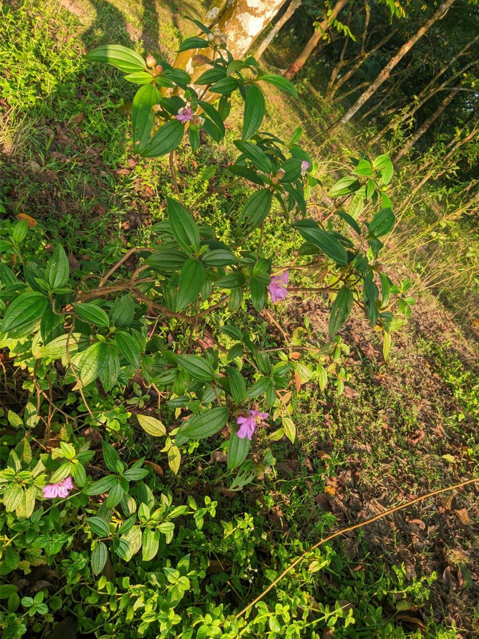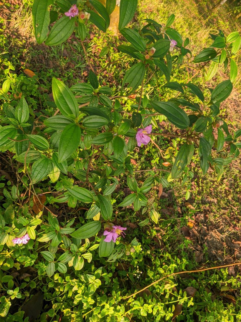 This plant is a species of Melastoma, commonly known as the Malabar Melastome. Its flowers are usually purple in color, and its stems are reddish in appearance. This plant is widely found in some regions during the summer and typically grows in various open areas, along roadsides, and among different types of forests.