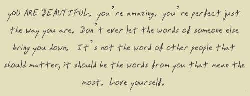 It doesn’t matter if you’re twenty or fifty. We all have little and big things that we don’t like about ourselves, no matter how much we try not to. But one day someone will come and embrace every little pieces of you and makes you feel perfect, someone who will give you strength and love, someone who will care for you and love your flaws. Love every part of you, someone you don't expect but he will come and gave some colors and meanings into your life.