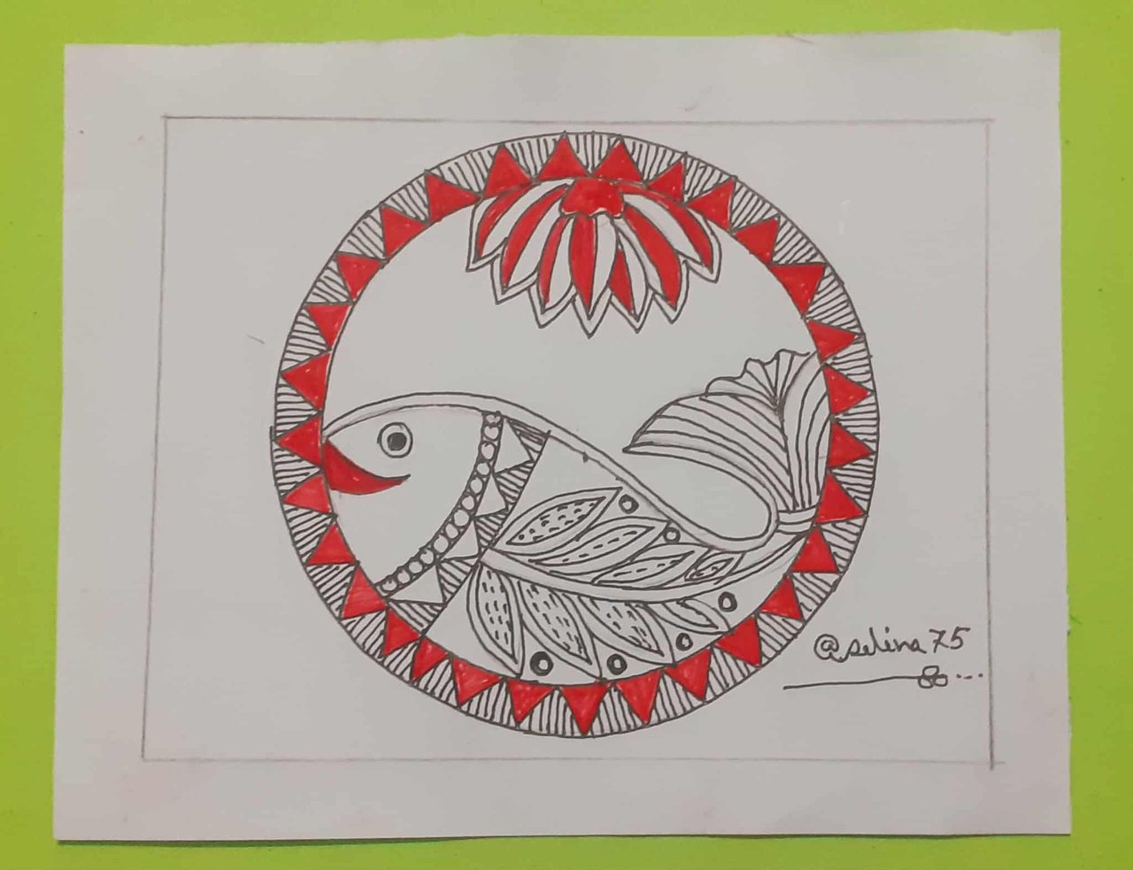 এবং মধুবনী আর্ট এর কিছু কিছু অংশ লাল রং এর সাইন পেন দিয়ে রং করে নিয়েছি।