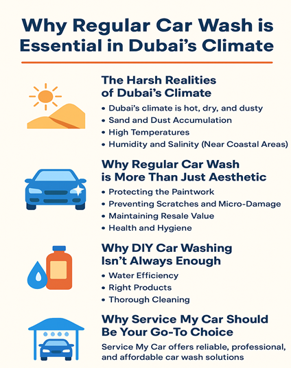 Regular car wash in Dubai's climate is essential for maintaining your car's health, appearance, and value. With factors like sand, dust, heat, and humidity constantly affecting your vehicle, skipping this simple step can lead to long-term damage and expensive repairs. By choosing professional services from Service My Car, you ensure your vehicle receives the care it deserves---keeping it clean, protected, and road-ready no matter the season. Their range of services, from basic washes to deep cleaning and paint protection, caters to all your car care needs in Dubai's challenging environment.