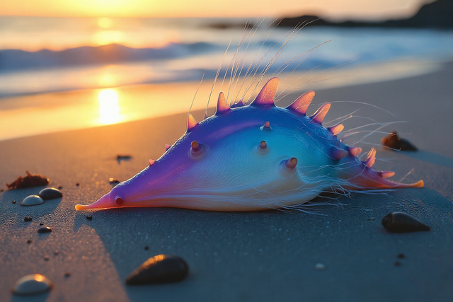 The Portuguese man-of-war are like jellyfish, but they are not, sometimes they appear as pests on the beaches, they are not jellyfish, they are a colonial organism, a synophore, it is made up of a colony of individuals and each individual specializes in something, some make the bag, others the tentacles, but it is not exactly an animal, it is a colony, it is a collaboration between individual beings.