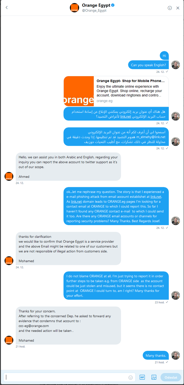 3.a notification of Egyptian ORANGE on existence of an e-mail account at link.net from which the attack was done (no matter whether it is stolen or real attacker's account): I was not able to find any relevant contact at egORANGE pages related to security issues reporting. Nothing. Zero. So I turned to Twitter support. Result: After a short clarification I finally got an e-mail I can write to which I will do. See a screenshot for conversation details.