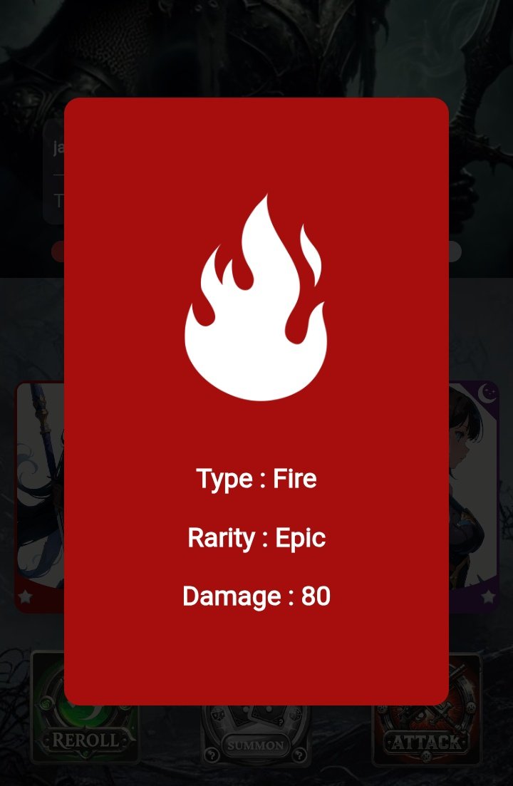 So then I pressed the play button. Then I clicked on Sumon and three cards came out. I clicked on the cards. First card Type: Fire, Rarity: Epic and Damage: 80. Second card Type: Water, Rarity: Rare and Damage: 50. Third card Type: Dark, Rarity: Rare and Damage: 50.