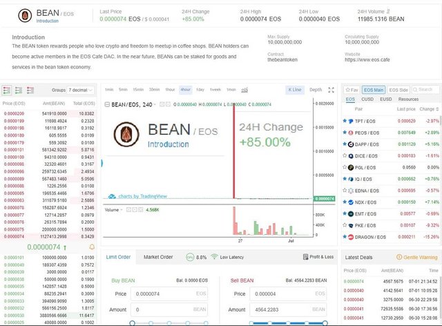So I pumped a new coin today on @newdex https://newdex.io EosCafe's BEAN and together with PSO and ANX these are the three most popular Venezuelan crypto projects and so I expect them to have a head start in the world with millions of Venezuelans having an innate interest in seeing these coins do well. The eoscafe business model is really reminding me of steem-engine.com and its ENG staking to get new features for your tokenized social media site....because EOS cafe allows staking for membership to a small company like a coffee shop. For example you can offer something like free wifi and 1 cup of coffee a day as membership to everyone who buys and stakes 10000 BEAN or whatever- for 30 days and then they get their token back and can sell or restake. You get a cut to fund your business and it's all very interesting as it leverages staking and crypto for s small brick and mortar business