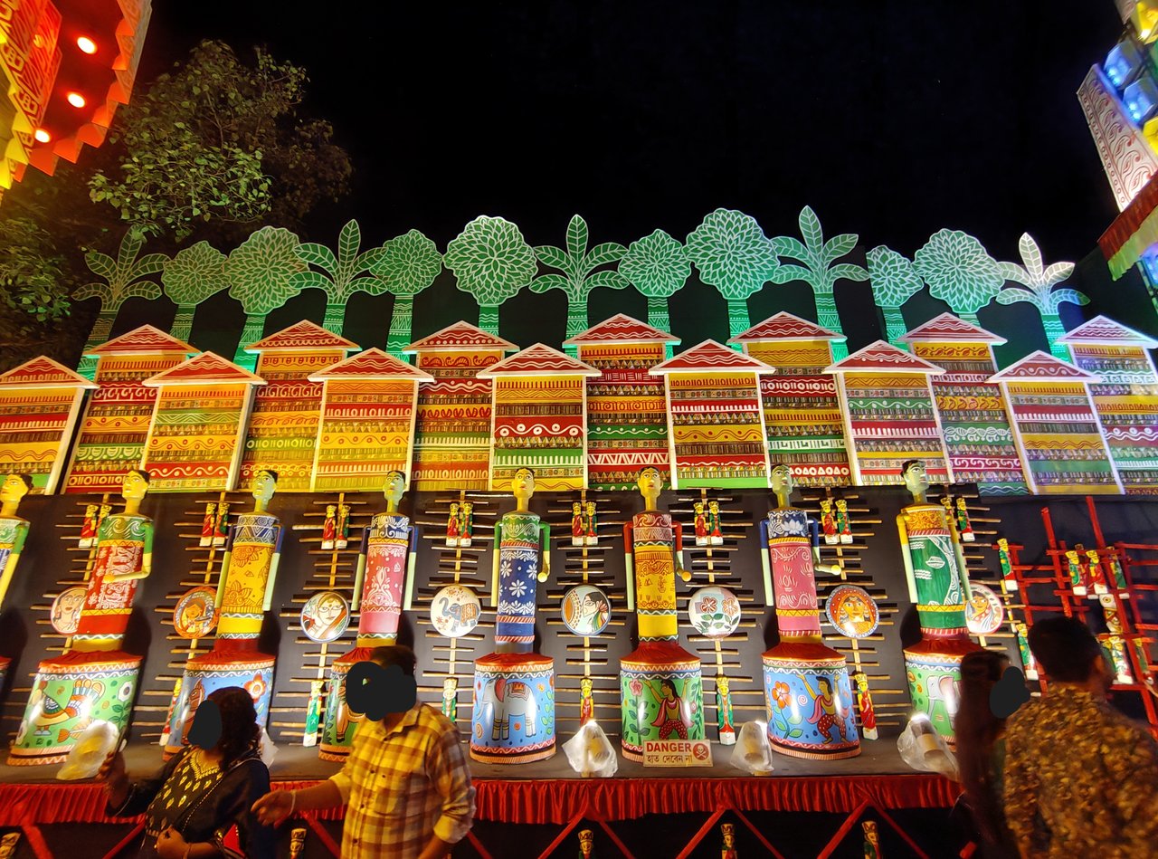 এছাড়া উপরের অংশে আপনারা দেখতে পাচ্ছেন যে বিভিন্ন ধরনের আলপনা এবং ছবি দিয়ে পুরো মন্ডপ সাজিয়ে তোলা হয়েছে।