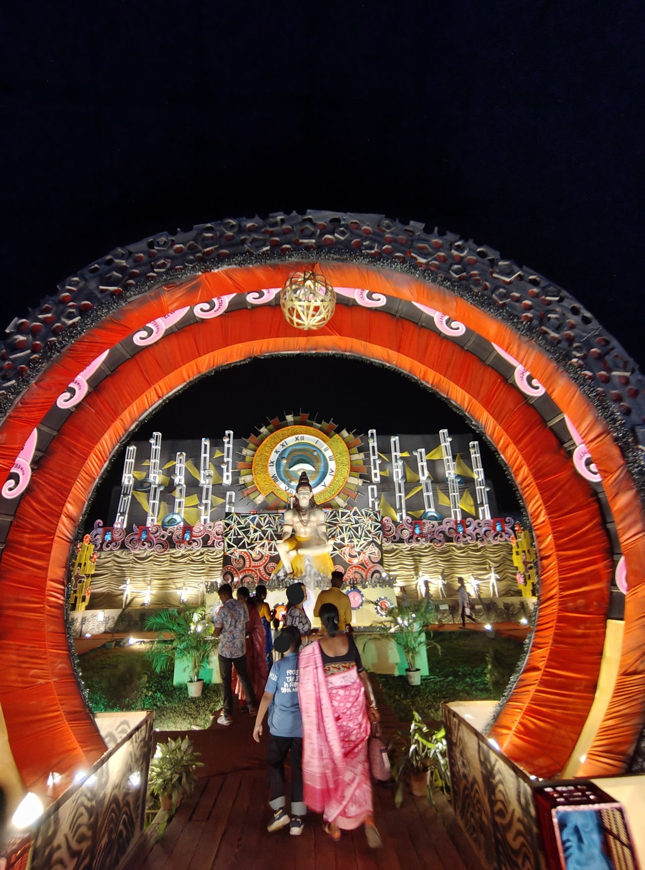 তো যতই ভিড় হোক না কেন বাড়ির পাশের পুজো বলে কথা তাই ভালো করে ছবি তুলতেই হবে। এই জন্য সকল বাঁধা উপেক্ষা করে আমি এক জায়গায় স্থির ভাবে দাঁড়িয়ে ছবি তুলতে লাগলাম। আসলে আমি প্যান্ডেলের একদম সামনে থেকে আবার পুনরায় পিছনের দিকে গেটের ছবিটি তোলার চেষ্টা করলাম।
