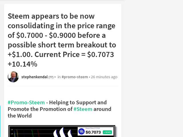 Title:Steem appears to be now consolidating in the price range of $0.7000 - $0.9000 before a possible short term breakout to +$1.00. Current Price = $0.7073 +10.14%