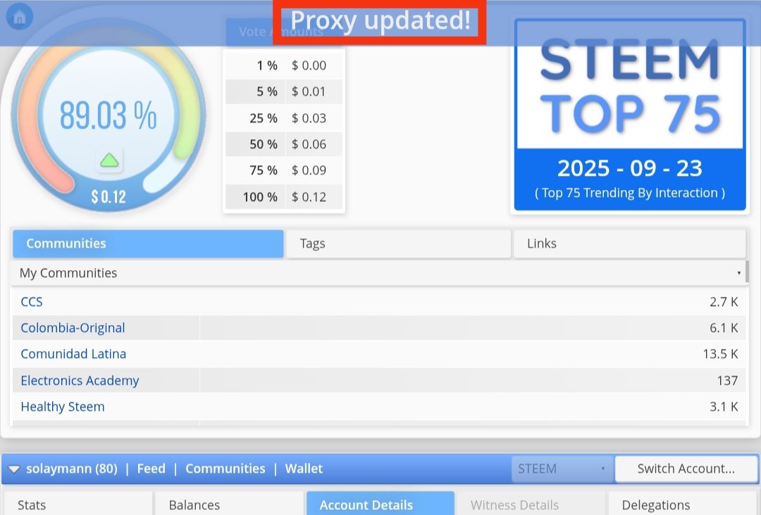 You will then receive a notification that your account proxy has been updated. After waiting a few seconds, you will see that your account's witness proxy has been set to the @steem-atlas account.