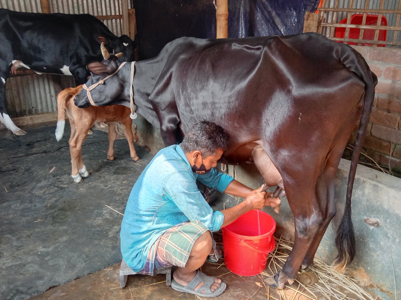 After my son came home, I fed the cows. If the cow eats, we give it straw. Then cowal comes to milk the cow. I do the milking of the cow myself and the cowal wala does it. When the cow is milked, I measure the milk. Then at 10 o'clock in the morning I ate rice. Then I went to the market to get beef feed.