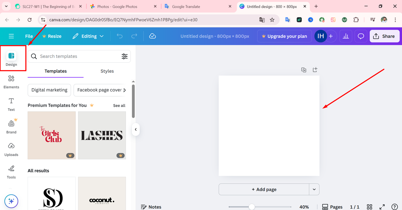 Now you can see that I was taken to a new page, and according to my size, a template has been given here, which is displayed, and on the left side, you can see some designed templates. From there, you have to customise it according to your liking.