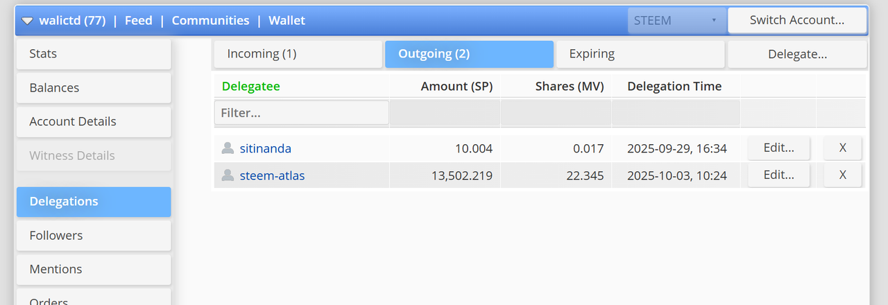 Selanjutnya saya akan selalu mendukung Project Steem-atlas dengan cara rutin menambahkan delegasi ke Steem-atlas. Caranya mudah, saya cukup pergi ke https://steemworld.org/@walictd dan memilih Delegation -- > Outgoing ---> Pilih steem-atlas ----> Edit.
