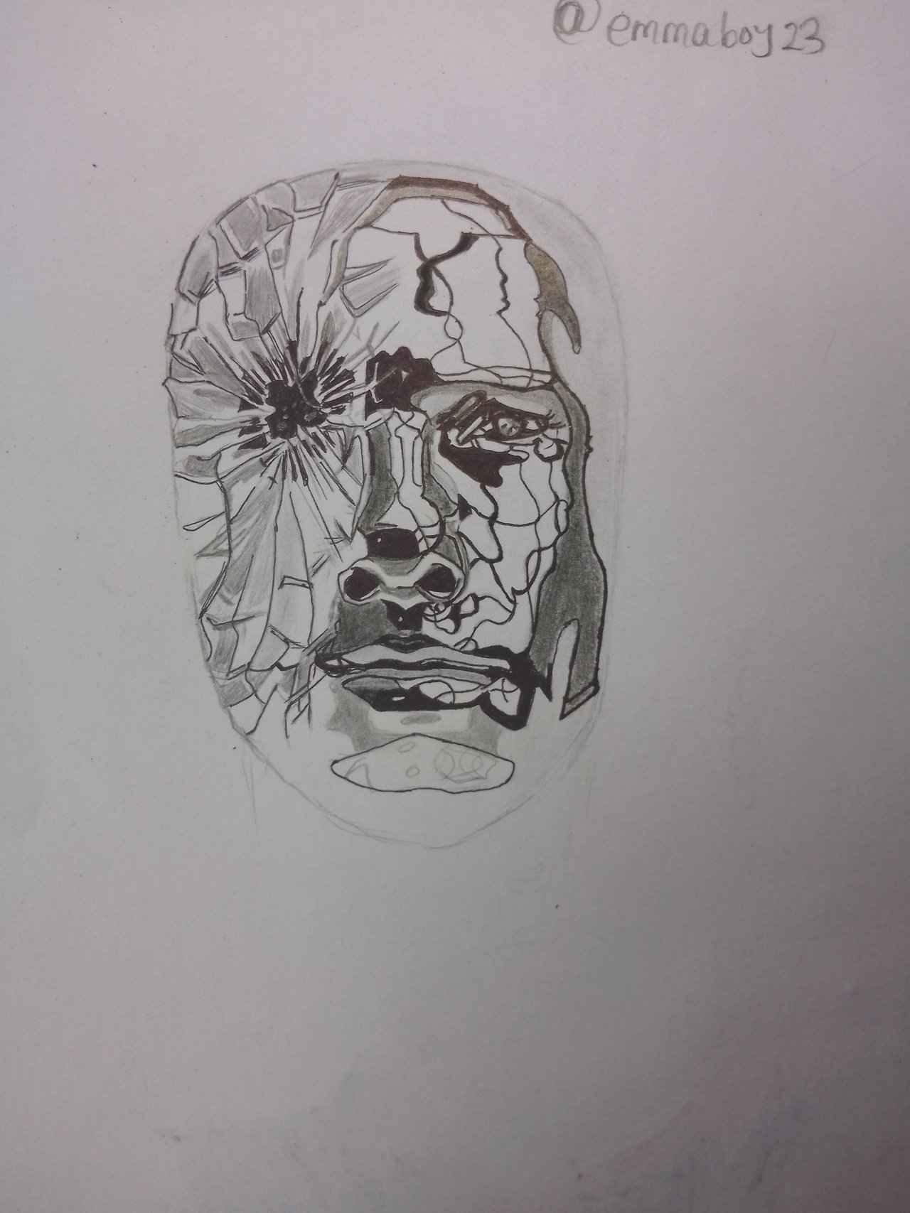 Once I completed the outline, I started drawing random fracture lines across the left side of the face, allowing them to flow naturally, like veins spreading from a point of impact. To achieve the “shattered explosion” around the left eye, I used short, sharp strokes radiating outward, giving the illusion of broken glass bursting from that point.