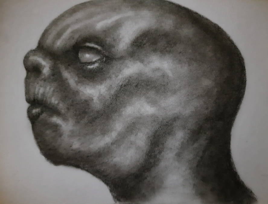 The process for this started with laying down a rough shape with a cotton ball and black pastel chalk, I then use a cotton bud to refine the shapes before using Staedtler Mars black pencils. (4B,8B)