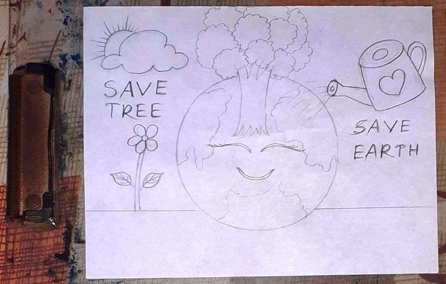 ❖প্রথম ধাপে- স্কেচ পেন্সিল দিয়ে একটি বৃত্ত অর্থাৎ পৃথিবীর মতো দেখতে অঙ্কন করে নিয়েছিলাম। এরপর মাঝখান বরাবর গাছ এঁকে নিয়েছিলাম। এরপর এক পাশে ফুলের গাছের মতো এবং অন্য পাশে জল দেওয়ার পাত্র এঁকে দিয়েছিলাম এবং একই সাথে মেঘের আড়ালে সূর্যের দৃশ্য এঁকে দিয়েছিলাম।