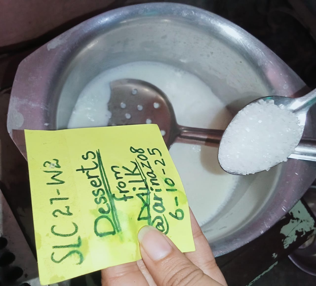 So let me tell you first that I have taken a new empty vessel and I have taken milk in it. I have started boiling the milk and when it gets hot inside it, I will put my sugar in it so that it gets hot quickly and I want to make it fluffy and as soon as I feel that it has got hot, now I put sugar in it and as soon as the sugar is mixed, I had put some milk in a vessel. We have to take that milk in it.