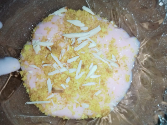 We have added chopped almonds and inside it, the cake batter that I had made is also put on top of it. Now I will give another layer of frosting. It looks very beautiful now. I will give another layer of cake batter on top of it and then I have made a little more than the proven almonds and also chopped almonds on top.