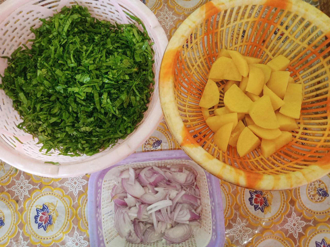- I cook spinach a little differently. Most people chop the spinach and boil it first, then blend it well and then cook it. But I have always made it by finely chopping the spinach and roasting it in spices. I chopped the spinach. Sliced the potatoes into small pieces. Then cut I the onions into small pieces. I washed all the vegetables thoroughly. Because washing everything thoroughly before using it kills germs. And makes everything healthier.