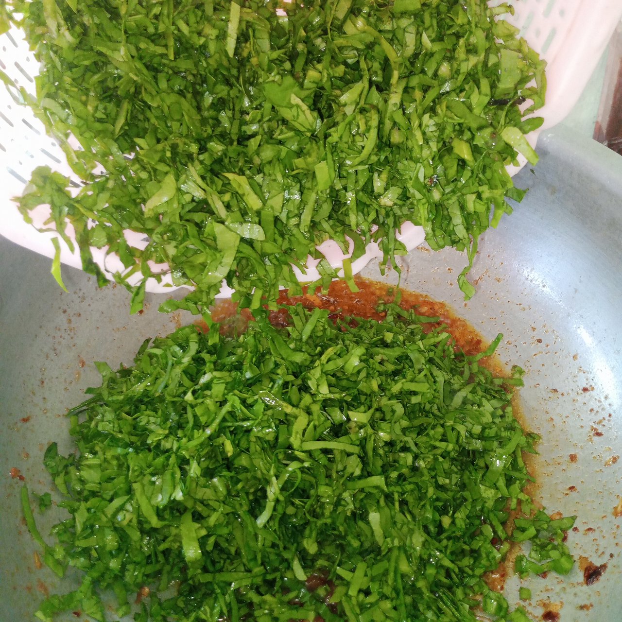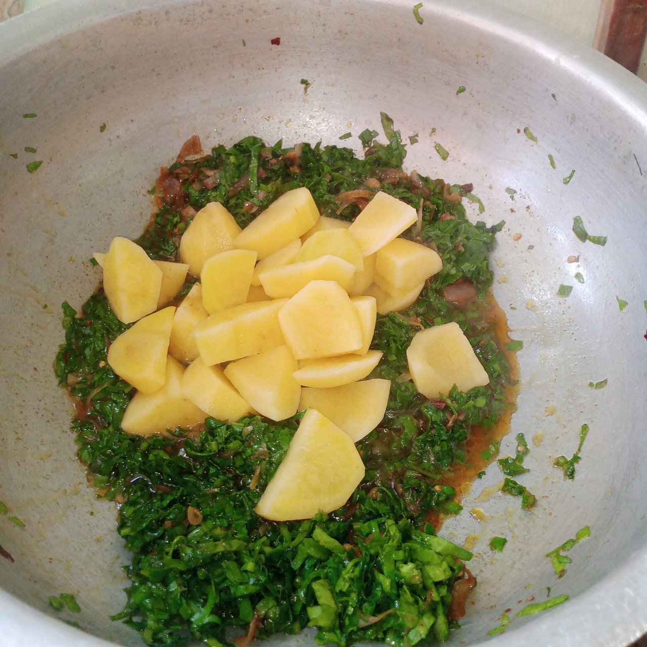 - When the spices were well fried. I started adding the chopped spinach to it. I added the spinach to the spices mixed it well and cooked it for three to four minutes. When the spinach started to cook. After that I put the potatoes to it.