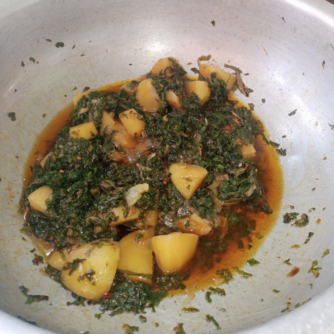 - I mixed the spinach and potatoes well and added about a cup of water. When spinach cooks its own water is enough. But today's potatoes are very soft and don't cook quickly. So I added a cup of water to it so that both of these things cook well and become one. Then I put the lid on it and put it on a low heat to cook.