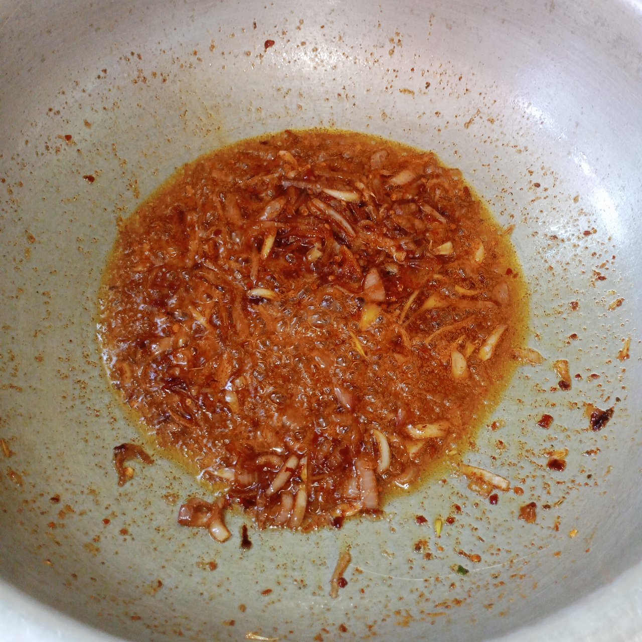 - I put the karahi on the stove. Turned on the flame. And poured ghee into it. When the ghee started to heat up I added the onions to it. After mixing the onions well in the ghee. I started frying them thoroughly. I fried the onions well for about three to four minutes.
