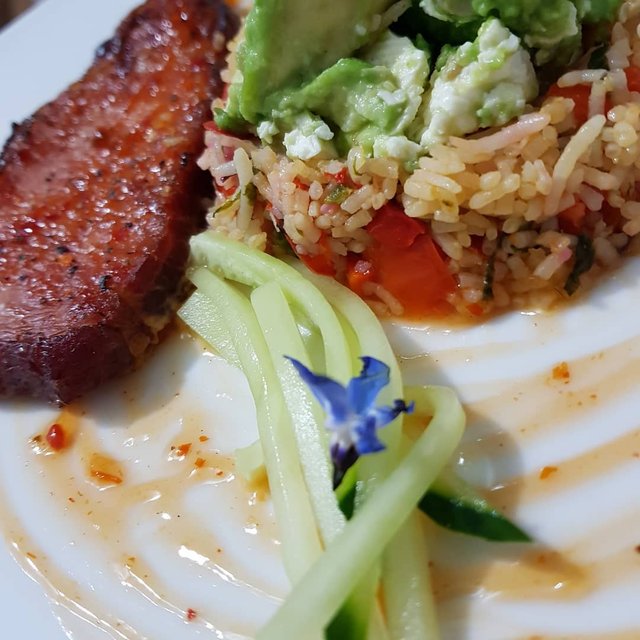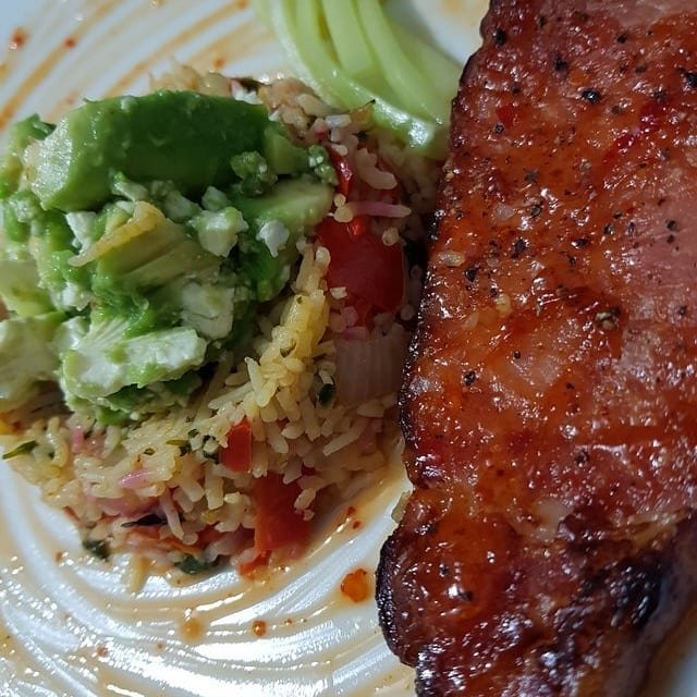 Deliciously Sticky Pork Kassler Chops with Salsa Salad Fried Basmati Rice