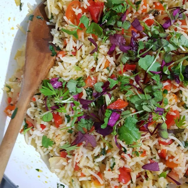 Throw them in the pan and saute them for a good few minutes and until most of the juices have dissipated. Once the rice is ready and the veg are frying nicely, begin to add your rice. Don't add it all at once! That will cool the pan down dramatically and will add too much moisture causing things to "boil". Add it in increments, the same way you would add cheese to a white sauce. At this point, I also added a few freshly chopped herbs...