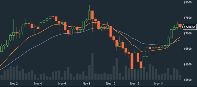 In the last couple of days, Bitcoin has experienced a lot of movements. From extreme panic to incredible euphoria in mere hours, I get caught wondering what pushes the coin to regain its price so quickly? As shown below, it was tanking hard in November 12 but was immediately back on the rocket pad November 13. I get that in something as speculative as cryptos, wild crazy swings are normal and to be expected. I was just thinking that it would be more like ETH or LTC, steady climb to higher price, right after a major correction.