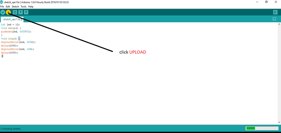 - copy the sketch code to arduino IDE sketch bar. click the UPLOAD icon on the upper right side toggle, it will automatically compile the sketch to check if theres an error with the code before uploading to the arduino board.