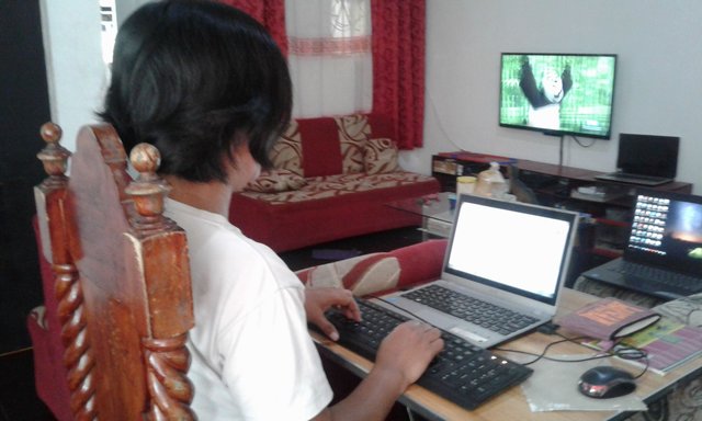 This is my living room with a typical set up of sofa and television...I don't go much of decorations as I want it simple...it may look not that good to anyone but i just love as it is...with my laptops anywhere I would like to work...look at them..hahaha! they are in different places. As I am using a wifi so I can connect any where in the place.