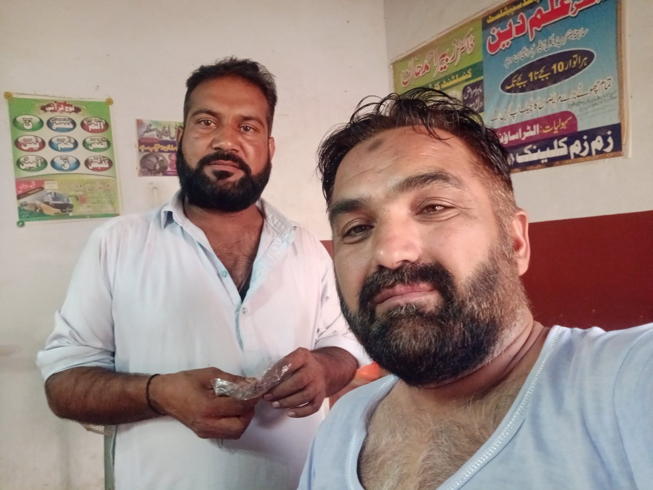 Similarly, the mechanic who was doing the washroom work arrived. Then I found out all the details from the washroom mechanic about which equipment to buy and which equipment not to buy so that he could guide me and I could go with those equipment. The mechanic who was setting the washroom told me and wrote down all the equipment and I went to Mianwali city to buy those equipment. When I reached Mianwali city, I went to many shops there. There were different rates and thus some shopkeepers were asking very high prices and some were asking less. But since I wanted to buy the equipment that was standard, I wanted to buy good quality, so I returned home with good quality equipment. I called the mechanic who was doing the washroom fitting that I had come with all the equipment. He said that he would come to my house on Sunday and then start the work. Similarly, the other workers and the mechanic were busy with work and when I reached home, it was three o'clock and since the mechanic and the workers work for eight hours and they work from eight in the morning to four in the evening. As soon as the mechanic and laborer left work at four o'clock, I put the stuff that was lying there in one place and locked it and then went back to my other house. When I returned home, I thought that I have a day off on Sunday too, so why not get my hair done today? So I went to the barber's shop and got my hair cut and there were a few white hairs in my beard and I dyed the hair I had dark brown. After getting my hair cut, I went back home. Now you can see the pictures. I made these pictures while sitting at the barber's shop and you can also see how the barber and I look in the picture. This is a beautiful memory that I have saved in the form of a picture in my camera and on my Steemit blog.