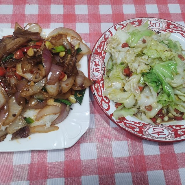 回锅肉下面是盖饭,手撕包菜炒了一大盘,又盛了一小碗🍚,吃完好饱啊。