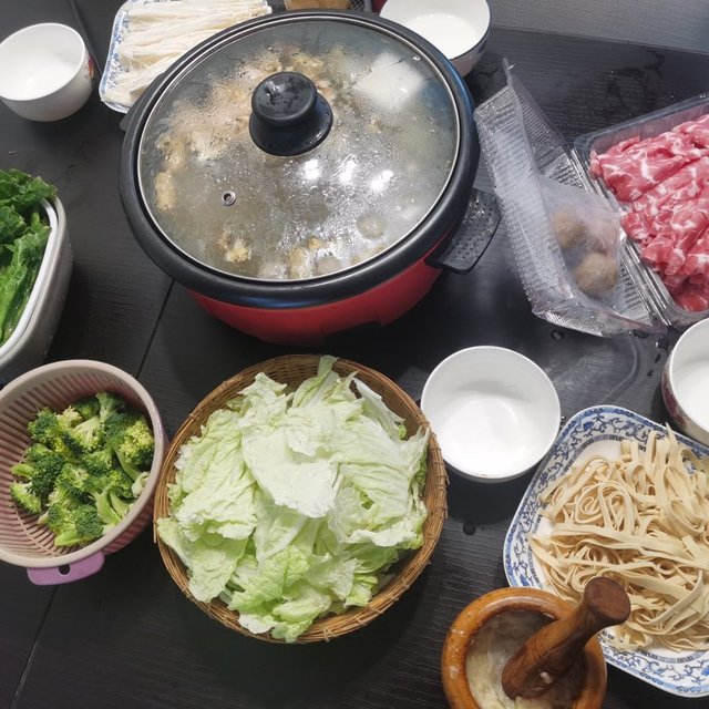 今天是中秋节,上午我带孩子到奶奶家。中午要吃火锅,去超市买了一堆食材。我又在楼下小店买了一个羊肉卷,两包牛肉丸子,两袋火锅面。