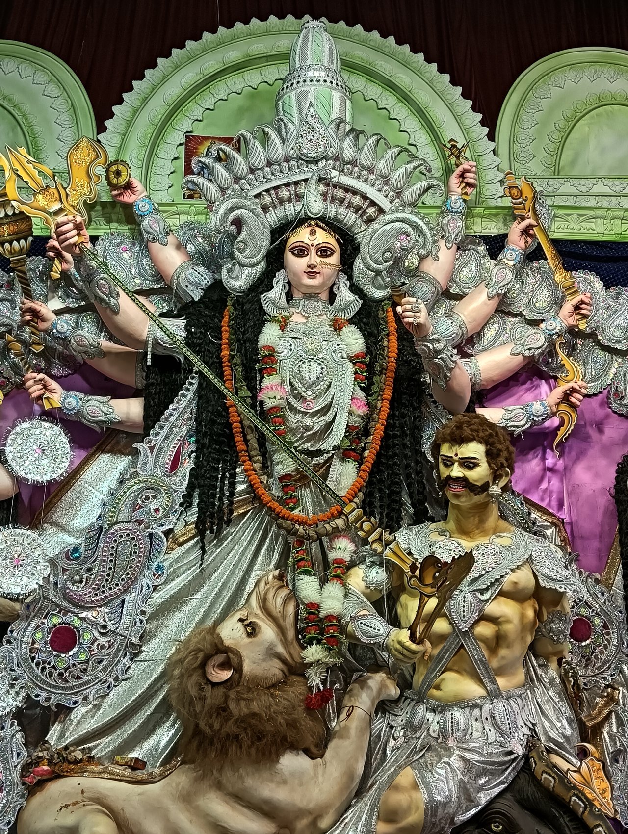 "এখানে মা দুর্গাকে রুপোর গহনা দিয়ে সাজিয়ে তোলা হয়েছে।মা দুর্গাকে রুপোর গহনা পড়ে দেখতে কিন্তু খুবই ভালো লাগছে।মায়ের দিকে তাকিয়ে আমার অবুঝ মনটা কেঁদে উঠলো কারণ মা আজ এই দিনটাতে মা আমাদের মাঝ থেকে বিদায় নিবে। মা যখন আমাদের মাঝে থাকেন তখন চারিদিক আনন্দে আনন্দিত হয়ে ওঠে রঙিন আলোতে চারিদিক সেজে ওঠে। যাই হোক,দুই হাত জোর করে মায়ের রাঙ্গা চরণে প্রণাম জানিয়ে বিদায় নিলাম মায়ের কাছ থেকে"।
