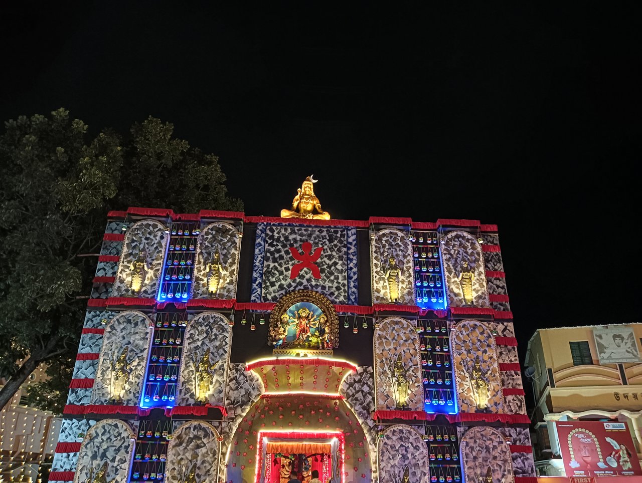 "এই প্যান্ডেলটি তৈরি করেছে উদয় রাজপুর নেতাজি সংঘ। এটি আমাদের বাড়ির পাশে মধ্যমগ্রামে পূজার প্যান্ডেল। এই প্যান্ডেলের সব থেকে আকর্ষণীয় বিষয়টি হলো। প্যান্ডেলের সবথেকে উপরে দেখতে পারছেন মহাদেব বসে রয়েছে। যার কারণে এই প্যান্ডেলের সৌন্দর্যটা আরো বৃদ্ধি পেয়েছে"।