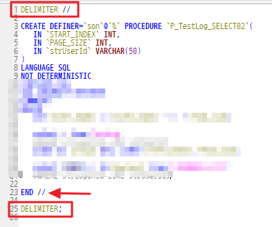 주의할 점은 DELIMITER 다음에 "//" 를 썼다면 저장 프로시져의 끝에도 "//" 로 끝을 내야하고, "$$" 를 썼다면 저장프로시져 끝에도 "$$" 써야한다는 점이다.